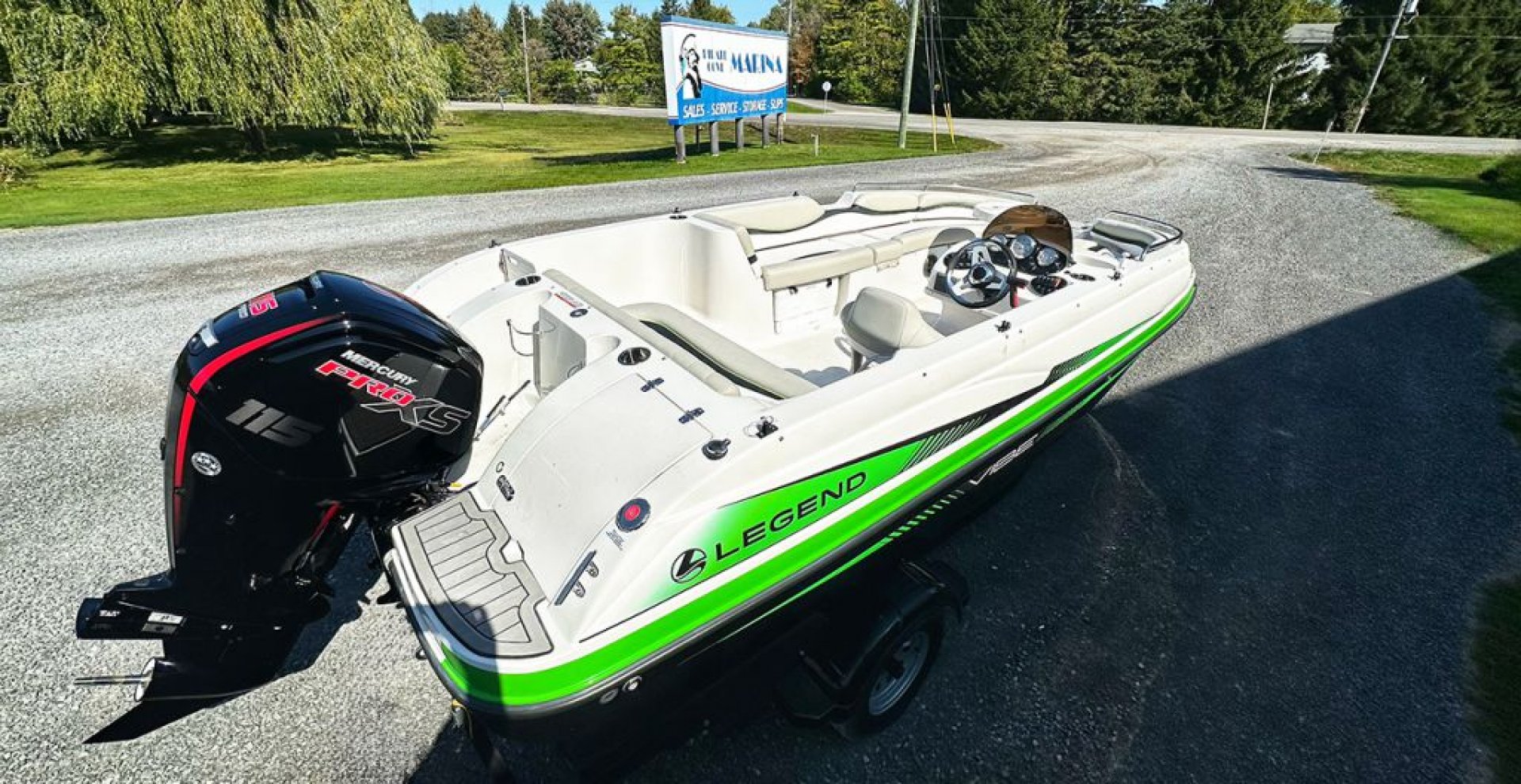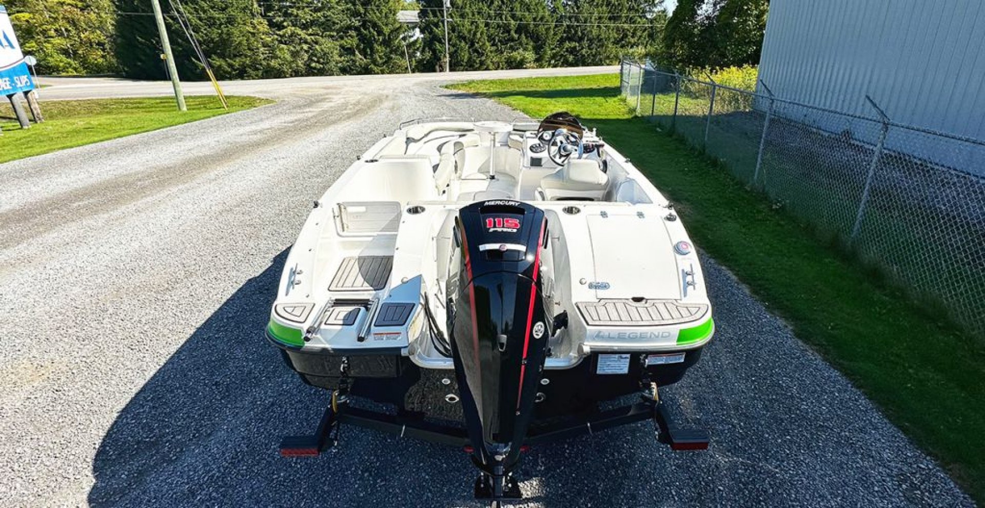 The 2024 Legend Vibe D19 is a 19-foot deck boat with a beam of 102 inches and a fuel capacity of 193 liters (51 US gal). It has a maximum capacity for 10 people or 2250 lbs, a package length of 24'1", and a towing weight of 3711 lbs. Key features include hydraulic assist steering, a deluxe captain's chair, AM/FM stereo with an auxiliary port and Bluetooth, Fiberglass integrated sink with standard pump faucet, Aerated bow livewell, Automatic bilge pump, a retractable ski pylon, non-skid marine matting, and a stainless steel retractable bow ladder.